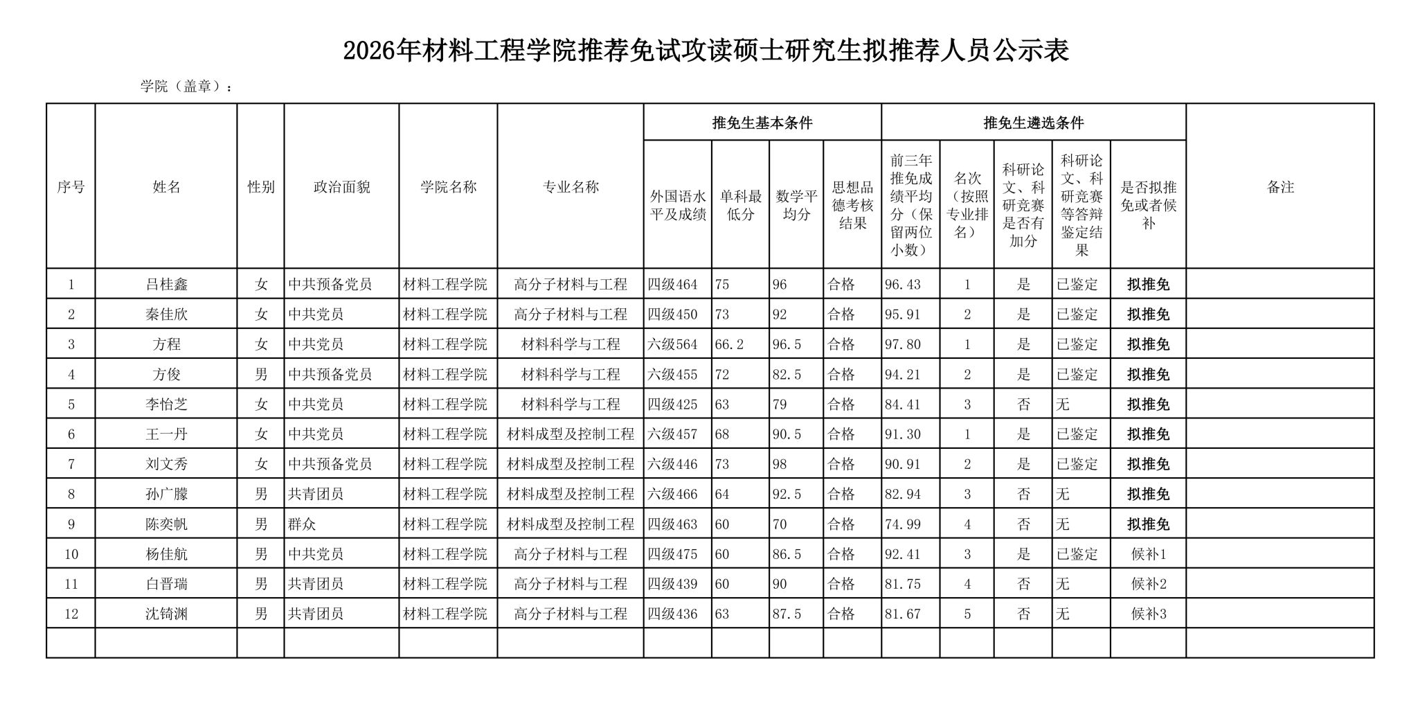 根据教育部有关文件及学校《关于做好我校2026年推荐优秀应届本科毕业生免试攻读硕士学位研究生工作的通知》要求,我院制定并下发了《材料工程学院2026年推荐优秀应届本科毕业生免试攻读研究生工作实施细则》。经个人申请、资格审查、推免生遴选工作领导小组审核等程序,拟推荐吕桂鑫等9人获免试攻读硕士学位研究生资格,杨佳航等3人为候补人员。